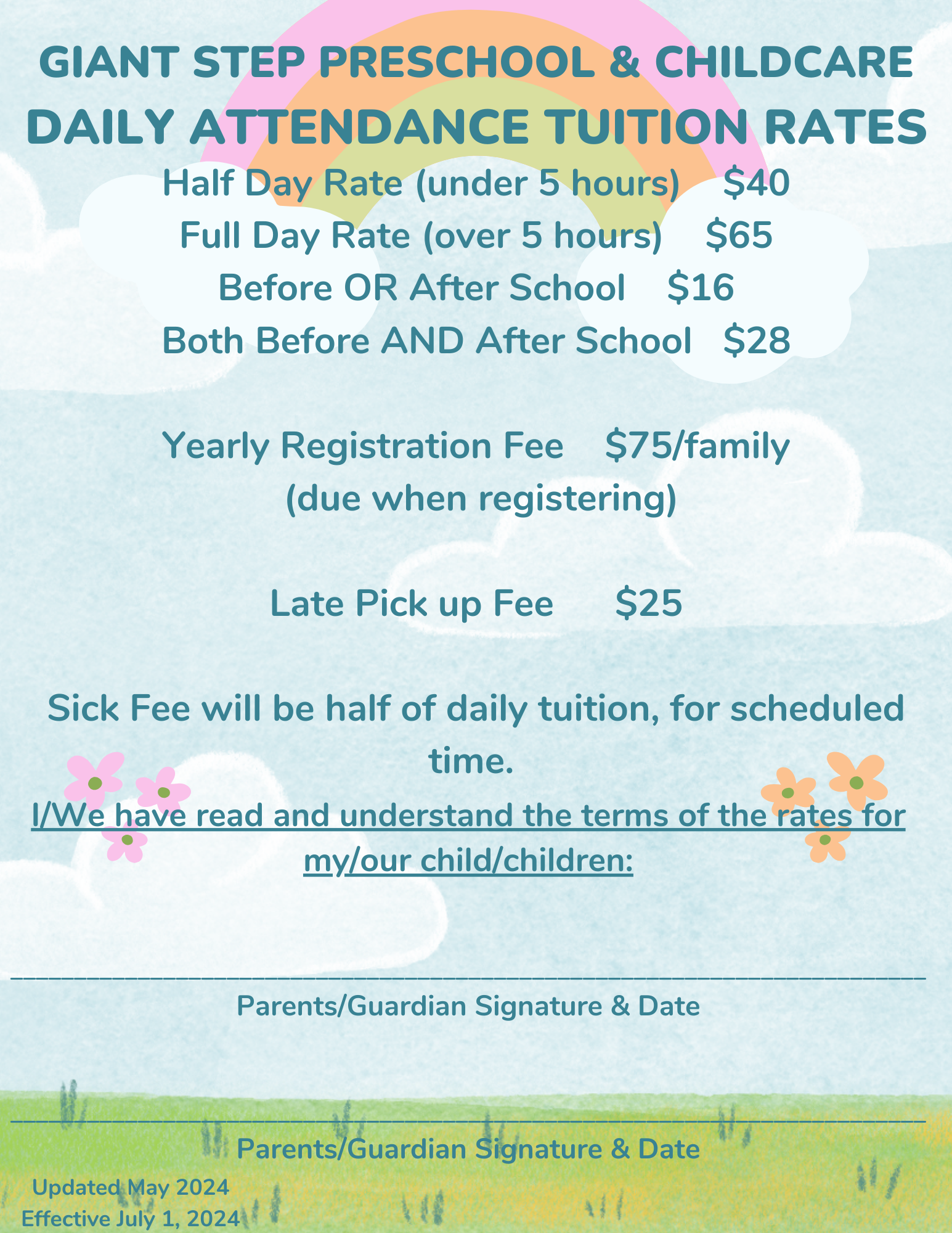 We have a new Rate Sheet, with rates that took effect July 1st, 2024. Families will see this change reflected in the latest bill (August 1st) due August 21st, 2024.