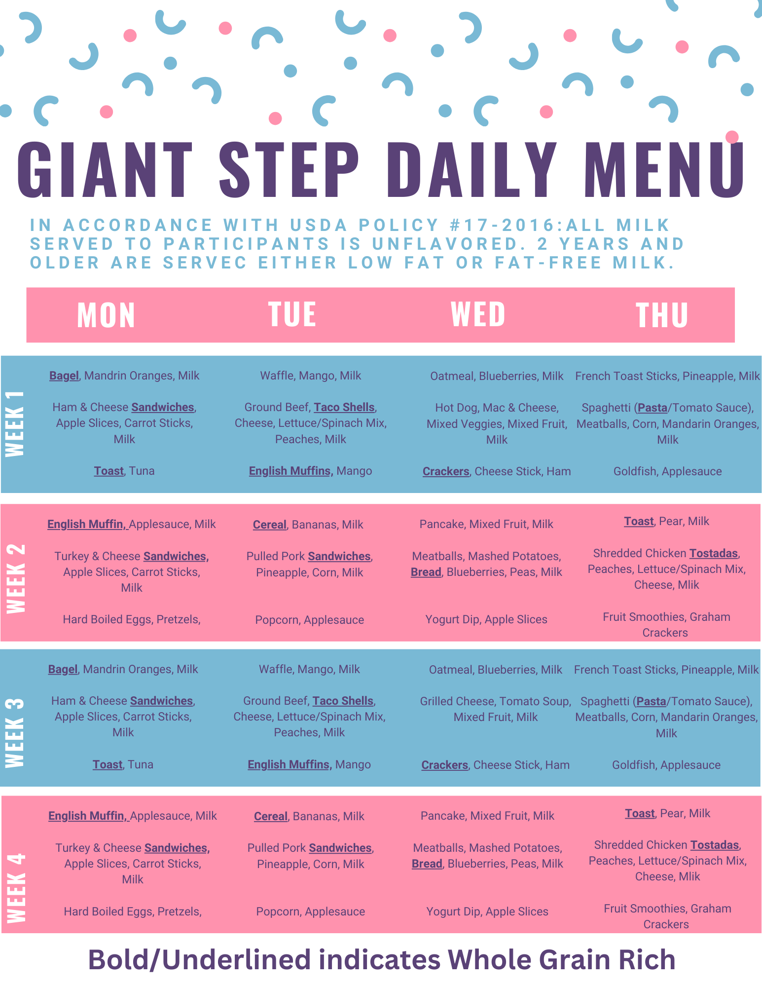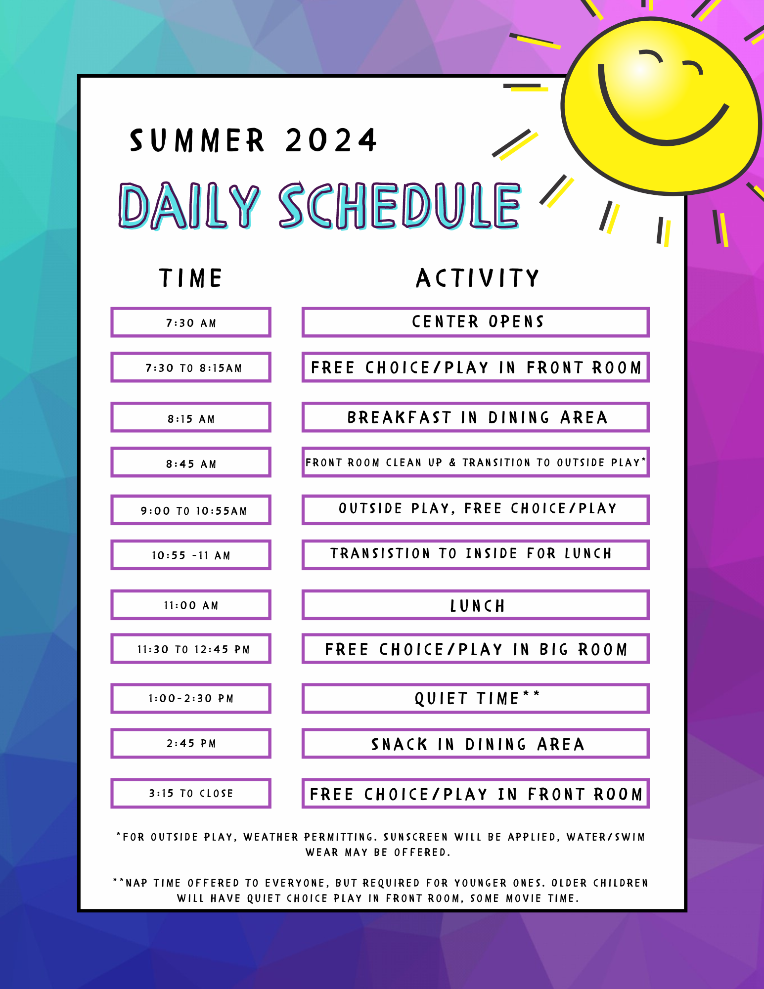 We have also updated our menu and our daily schedule. The summer schedule is effective until August 1st, after which we will follow our school year schedule.