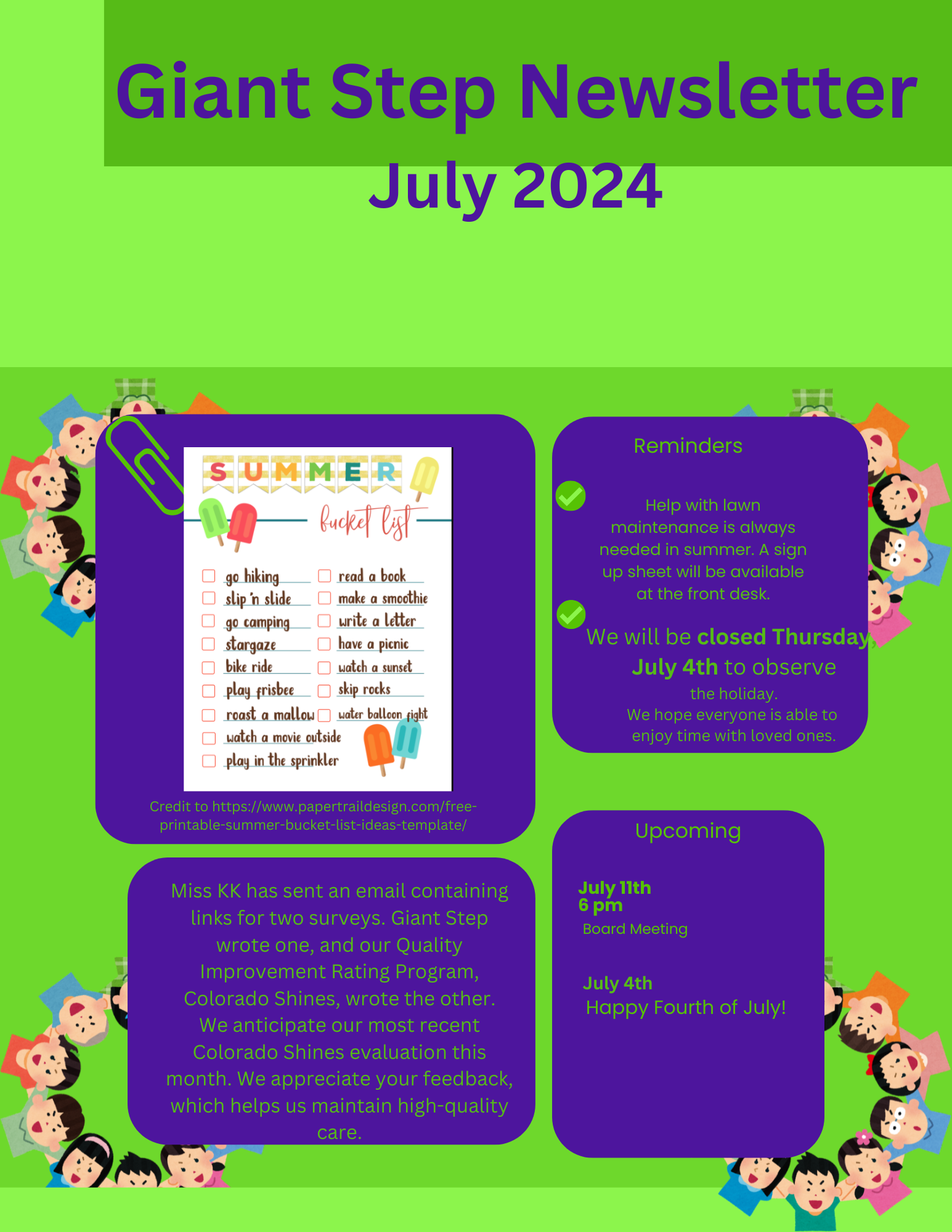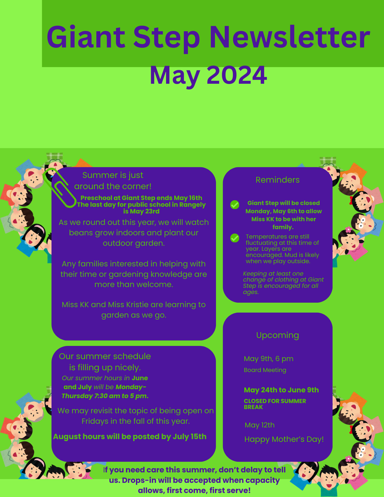 We write a newsletter every month at Giant Step to keep families informed! Feel free to use the links below to catch up on our latest goings-on!